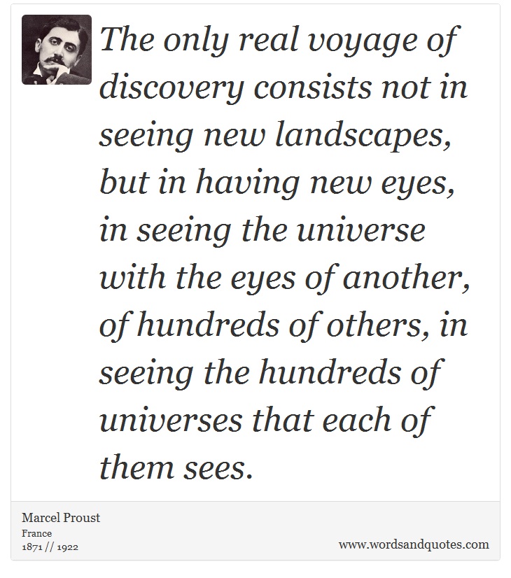 The only real voyage of discovery consists not in seeing new landscapes, but in having new eyes, in seeing the universe with the eyes of another, of hundreds of others, in seeing the hundreds of universes that each of them sees.