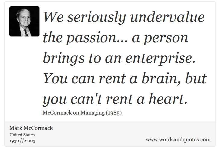 We seriously undervalue the passion... a person brings to an enterprise. You can rent a brain, but you can't rent a heart.